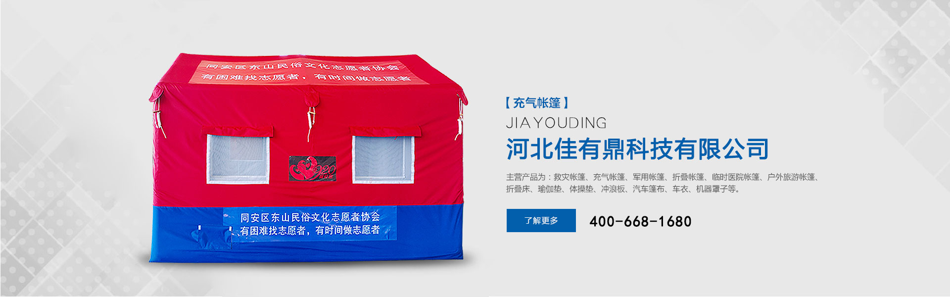 河北佳有鼎科技有限公司原為北京五環(huán)精誠帳篷有限責(zé)任公司多年來專注于應(yīng)急救災(zāi)防護(hù)和戶外用品的研發(fā),是一家集研發(fā)、設(shè)計(jì)、生產(chǎn)、銷售、服務(wù)于一體的綜合型公司。